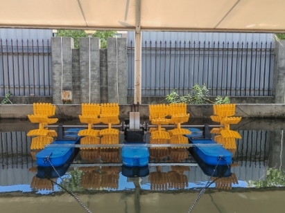 Плавающие колесно-лопастные аэраторы отлично разбрызгивают воду, создавая огромное множество мелких брызг обеспечивающих прекрасный контакт воды с воздухом. Одновременно образуется направленное течение. Таким образом, смесь воздуха и воды уносится течением, обеспечивая эффективный массообмен в водоеме. Активный воздух и течение обеспечивают очень хорошее обогащение кислородом застойных зон. При этом также происходит дегазация, с удалением азота, двуокиси углерода, сероводорода и других газов.