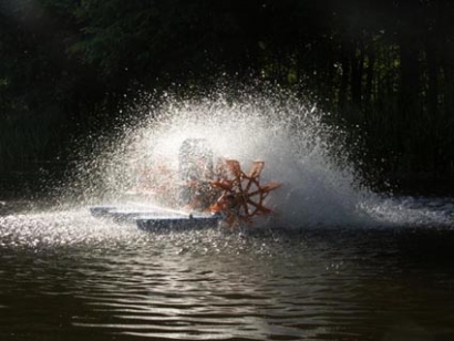 Плавающие колесно-лопастные аэраторы отлично разбрызгивают воду, создавая огромное множество мелких брызг обеспечивающих прекрасный контакт воды с воздухом. Одновременно образуется направленное течение.