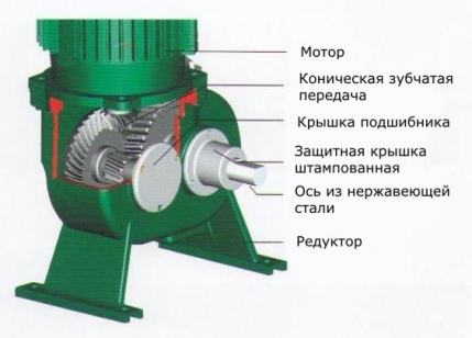 Вращение от двигателя передается посредством редуктора. Это гарантирует очень надежную работу в течение чрезвычайно длительной непрерывной эксплуатации и минимальное потребление электроэнергии.