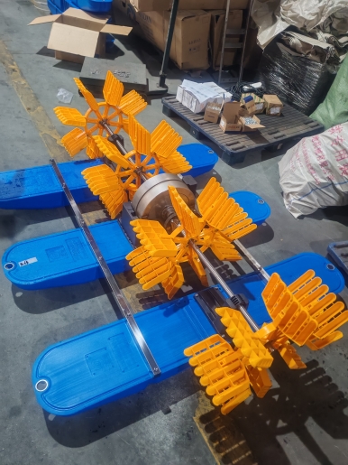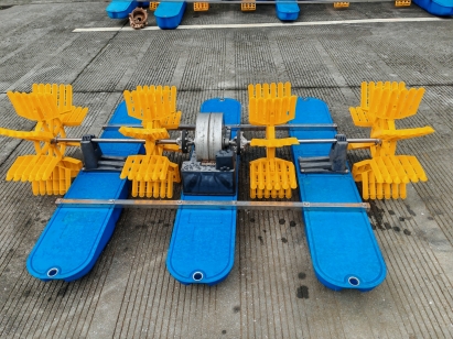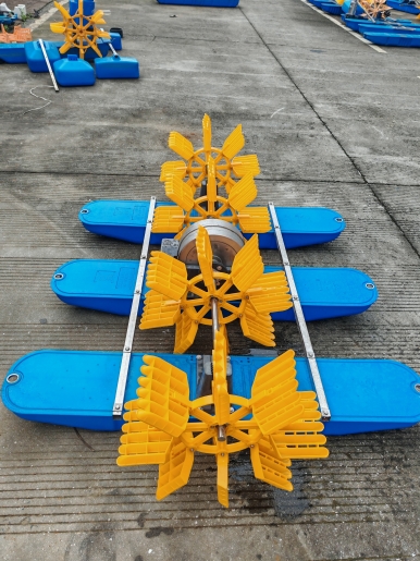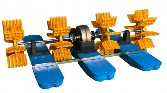 Лопастные колеса были специально разработаны для целей аэрации. Они создают очень хорошее течение. Эти специальные лопасти легко прикрепляются к колесам. Конфигурация лопастей и колес гарантирует оптимальную циркуляцию воды и разбрызгивание её с минимумом затрат электрической энергии. Очень высокая степень насыщения воды кислородом, эффективная дегазация в сочетании с сильным течением это преимущества данной конструкции.